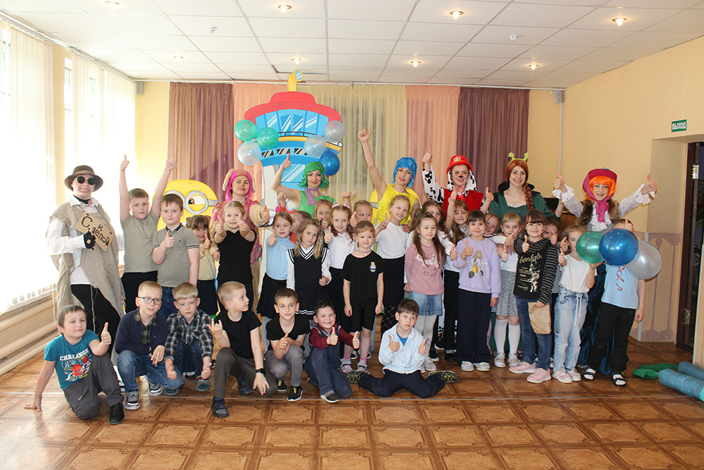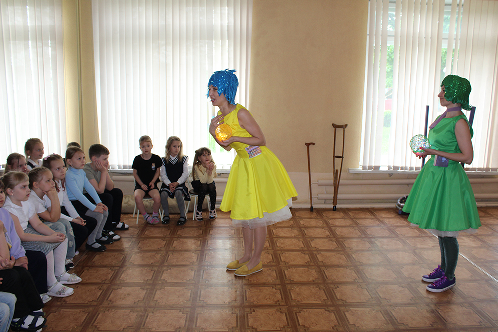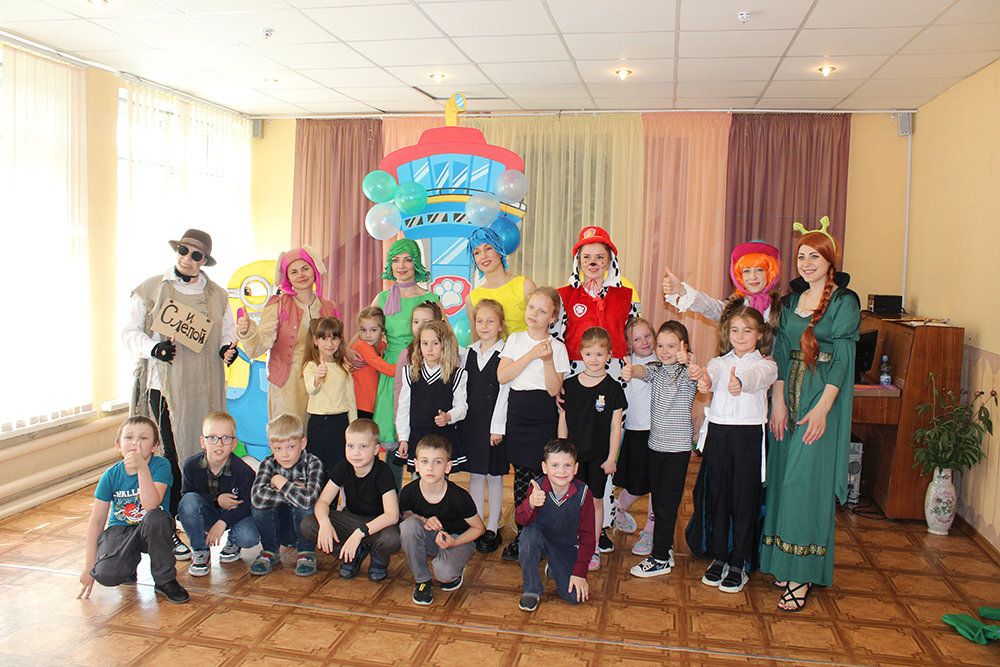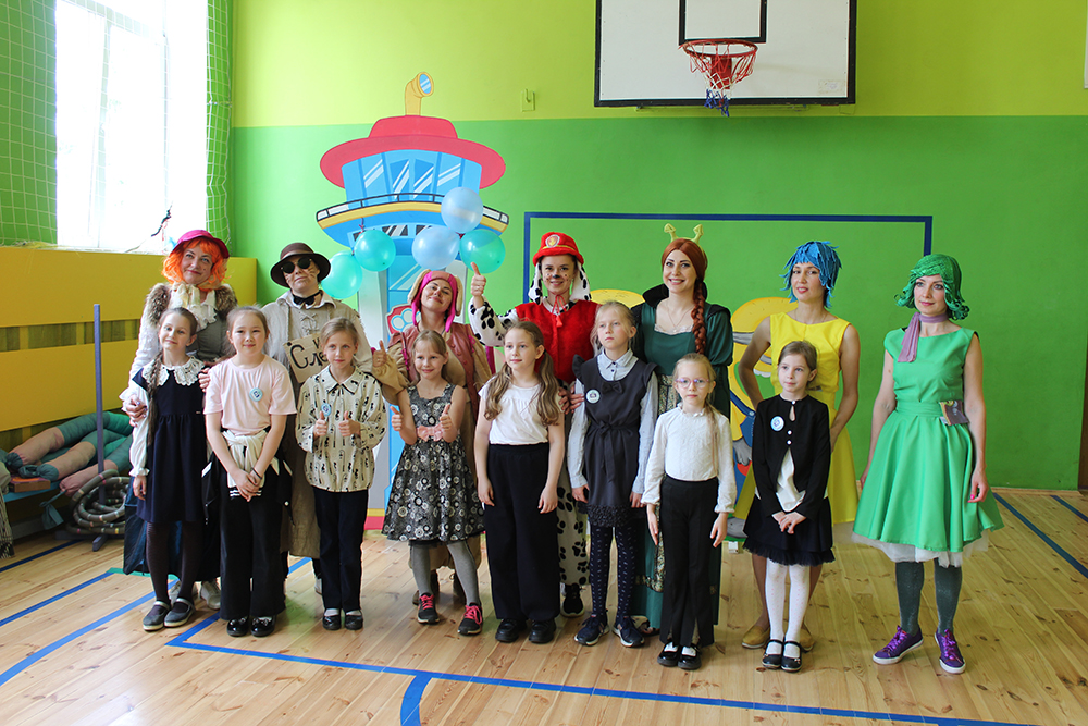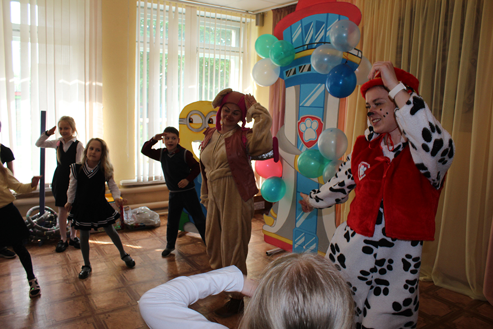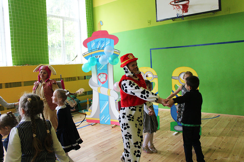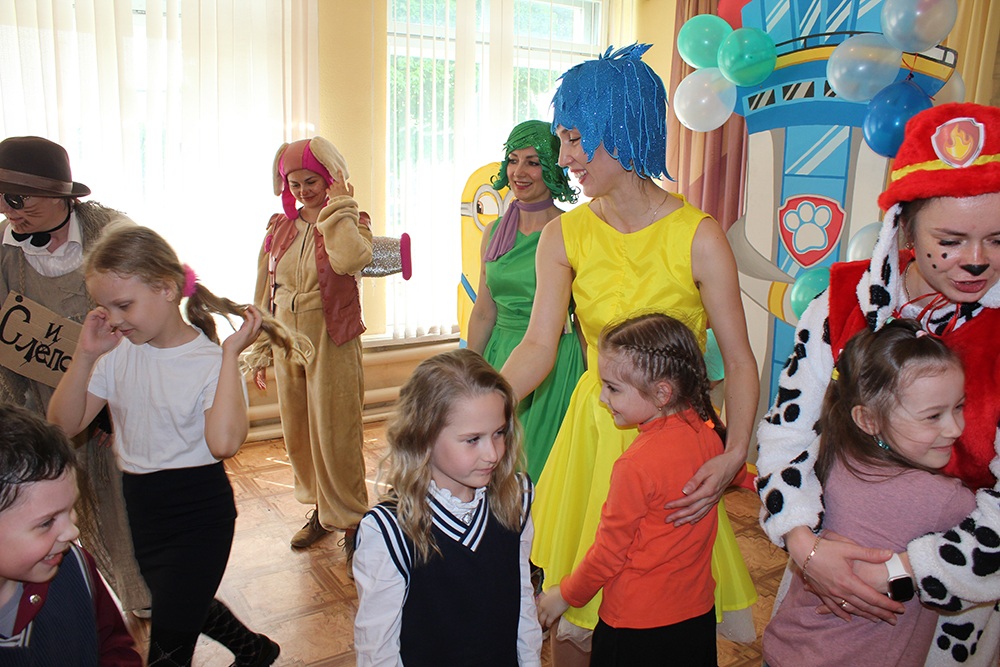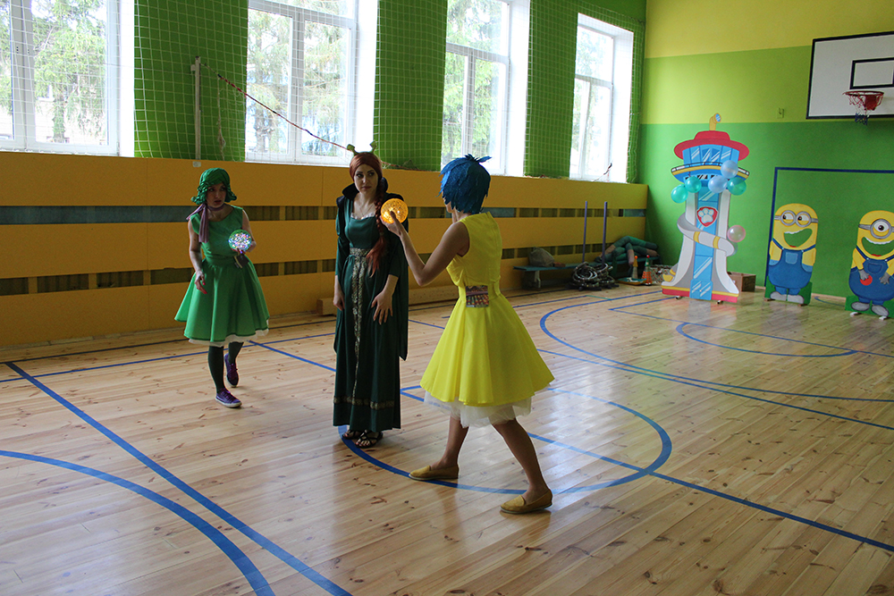 Весёлые и дружные спасатели Скай и Маршалл (Бараш Евгения, Минько Кристина), герои популярного мультсериала «Щенячий патруль», предложили ребятам отправиться вместе с ними в лето на самолёте. Весёлый танец на ускорение «Смотрите в небе самолёт» подарил девчонкам и мальчишкам хорошее настроение, а игра «Косточка» показала насколько ребята быстрые и ловкие, продемонстрировала их командный дух. Хитрые обманщики Кот Базилио(Самонова Валентина) и Лиса Алиса(Лепешева Екатерина, Межевич Ирина), конечно же, попытались испортить детям празник, похитив у Фионы ключ от лета. Но ребята не поддались на провокации сказочных мошенников, а с лёгкостью выполнили все их задания. Современный флешмоб «Если хочешь танцевать - танцуй, танцуй!», устроенный Лисой Алисой и Котом Базилио, очень понравился всем участникам мероприятия, а игра на меткость «Покорми Миньона» подарила им позитивные эмоции. Фееричным было появление в конце праздника героев популярного среди детей мультфильма «Головоломка» - Радости и Брезгливости - двух из основных персонажей, которые воплощают эмоции.