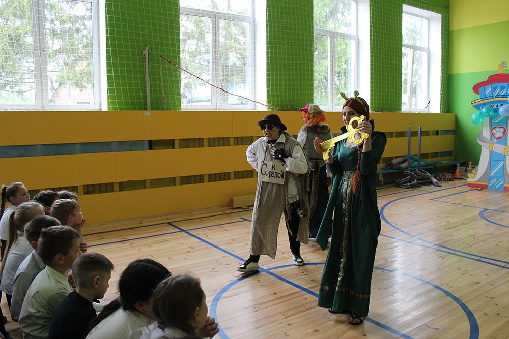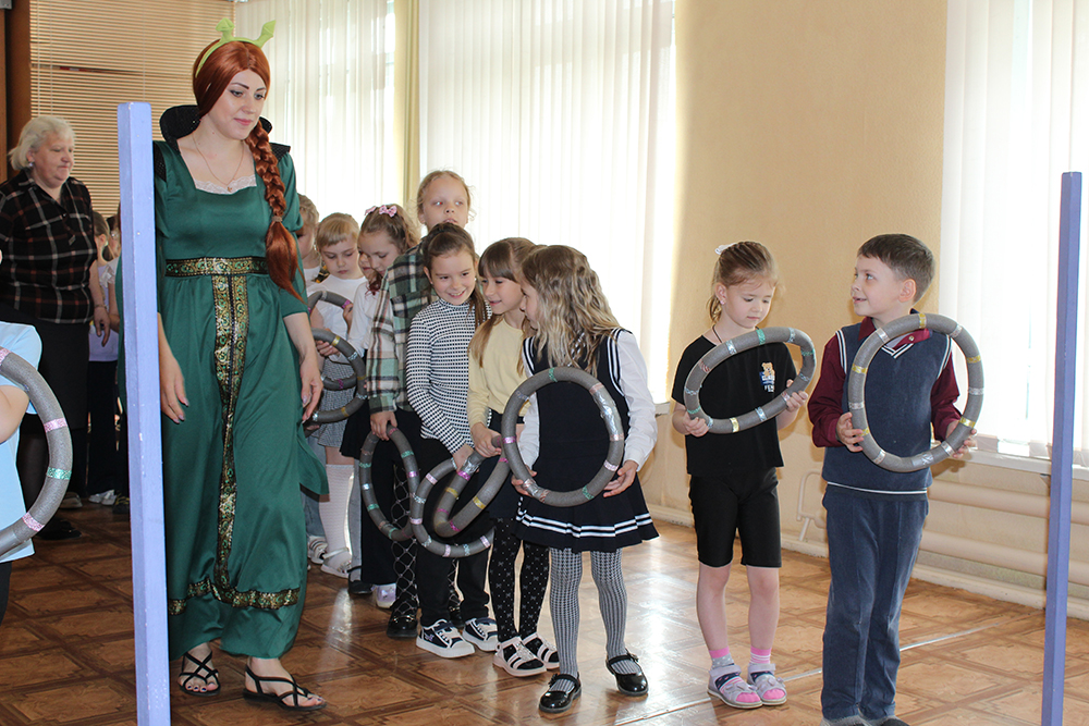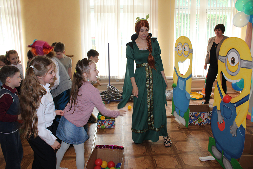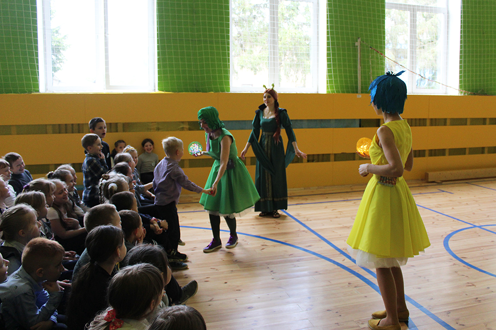 Яркие эмоции и весёлое настроение подарили ребятам герои их любимых книг и мультсериалов, роли которых ярко и феерично исполнили библиотекари. Очаровательная принцесса Фиона (Воробьёва Анастасия, Гегомян Алёна) сердечно поприветствовала ребят, поздравила их с окончанием учебного года, пригласила «Вместе праздник отмечать, вместе петь и танцевать, вместе лето открывать!». Вместе с Фионой мальчишки и девчонки дружно станцевали танец «Мы маленькие звёзды» и сыграли в игру «Кольцеброс».