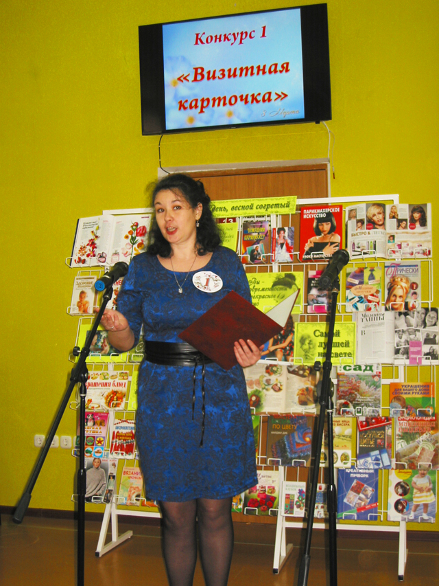 Начался конкурс  с домашнего задания «Визитная карточка». Участницы конкурсной программы в стихотворной форме и при помощи мультимедиа представили на суд зрителей и компетентного жюри рассказы о всей работе, семье, увлечениях и достижениях.