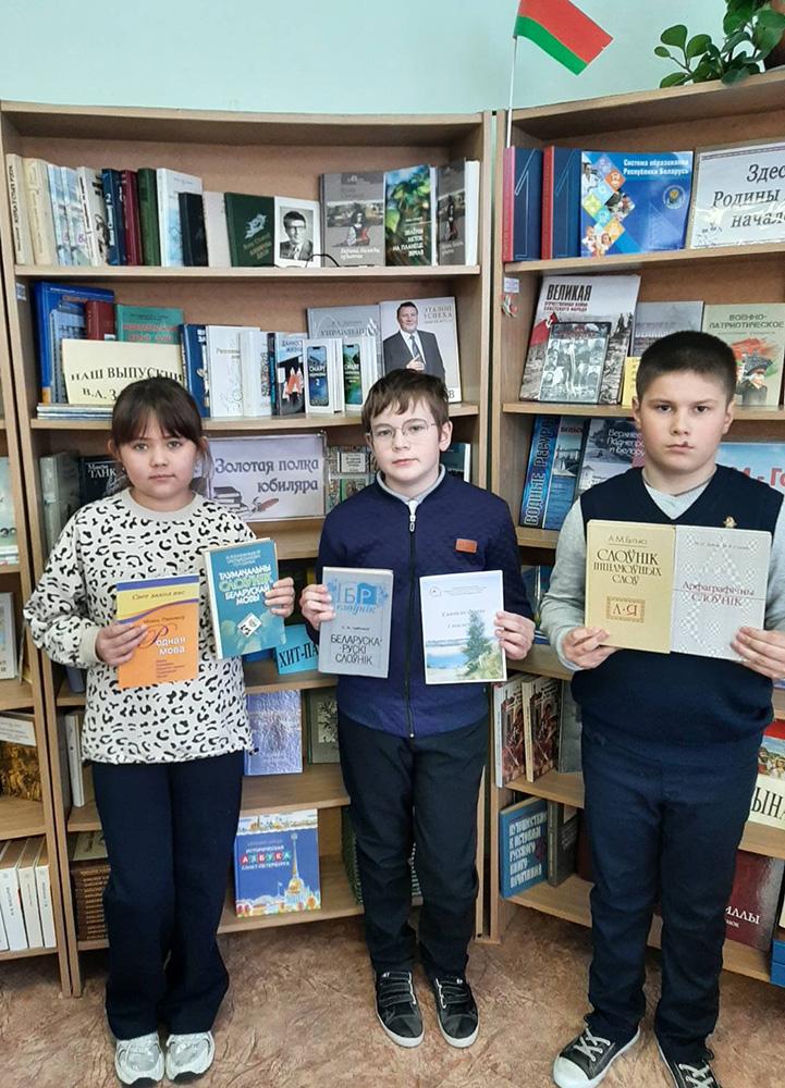 Вучні 4, 6 і 7 класаў завіталі ў бібліятэку і бібліятэкар расказала, на якіх паліцах размешчаны аддзел беларускай літаратуры, дзе можна знайсці кніжкі беларускіх аўтараў. Звярнула ўвагу школьнікаў на тое, што калі ўзнікнуць цяжкасці з напісаннем, тлумачэннем або перакладам слоў, на дапамогу прыйдуць слоўнікі.